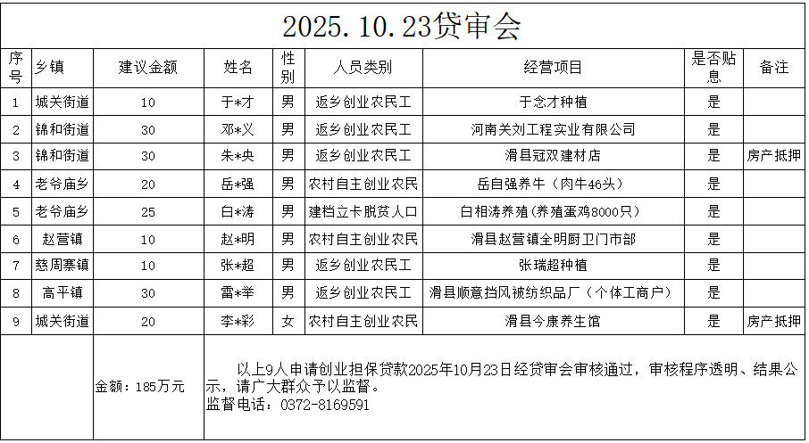 以上9人申请创业担保贷款2025年10月23日经贷审会审核通过,审核程序透明、结果公示,请广大群众予以监督。