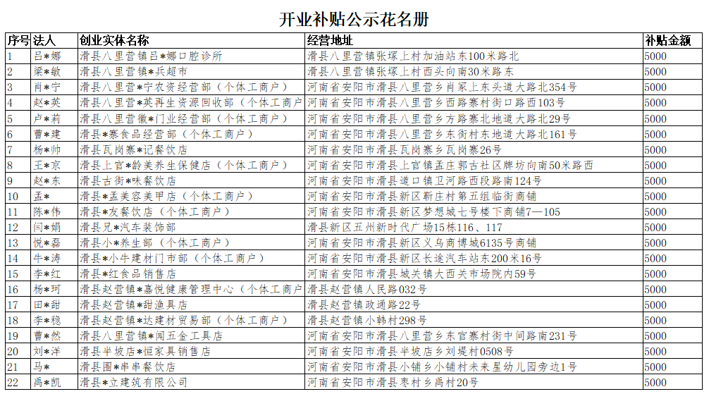 根据《河南省就业补助资金管理办法》(豫财社【2024】194号)第二章第十条文件规定,符合条件的2年内高校毕业生、返乡入乡农民工、退役军人,首次创办小微企业或从事个体经营,且所创办企业或个体工商户自工商登记注册之日起正常运营1年以上的,给予一次性开业补贴,补贴标准为5000元。经审核手续和现场勘查,滑县八里营镇吕艳娜口腔诊所等22家符合补贴条件,现将审核结果予以公示,接受社会监督,公示时间为五个工作日(2025年10月29日至11月4日)。在公示期内若对申请开业补贴的真实性有异议的可举报。