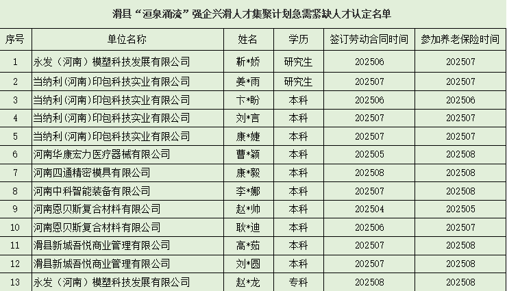 据中共滑县委办公室、县政府办公室《关于实施“洹泉涌流”强企兴滑人才集聚计划的实施意见》(滑办文〔2020〕2号)及人才认定相关细则规定,经单位初审,县人社部门审核,拟认定下列13人为急需紧缺人才,现予以公示。公示时间:2025年11月11日——2025年11月17日,如有异议,可在公示期内向滑县人力资源和社会保障局反映,电话和信函应告知真实姓名,对线索不清的匿名电话和匿名信件,公示期间不予受理。