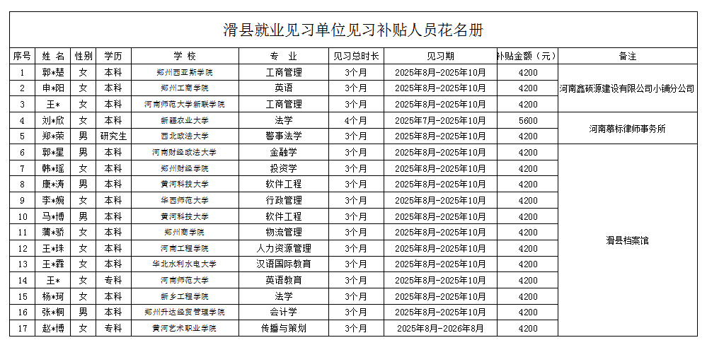 附件:滑县就业见习单位见习补贴人员花名册(附后)