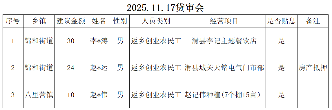 以上3人申请创业担保贷款2025年11月17日经贷审会审核通过,审核程序透明、结果公示,请广大群众予以监督。