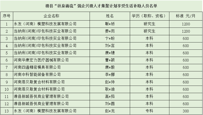 根据中共滑县委办公室、县政府办公室《关于实施“洹泉涌流”强企兴滑人才集聚计划的实施意见》(滑办文〔2020〕2号)及相关细则规定,经审核,拟对下列13人发放生活补助,现予以公示。