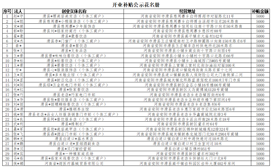 根据《河南省就业补助资金管理办法》(豫财社【2024】194号)第二章第十条文件规定,符合条件的2年内高校毕业生、返乡入乡农民工、退役军人,首次创办小微企业或从事个体经营,且所创办企业或个体工商户自工商登记注册之日起正常运营1年以上的,给予一次性开业补贴,补贴标准为5000元。经审核手续和现场勘查,滑县囍理美容美发店(个体工商户)等31家符合补贴条件,现将审核结果予以公示,接受社会监督,公示时间为五个工作日(2025年12月4日至12月10日)。在公示期内若对申请开业补贴的真实性有异议的可举报。