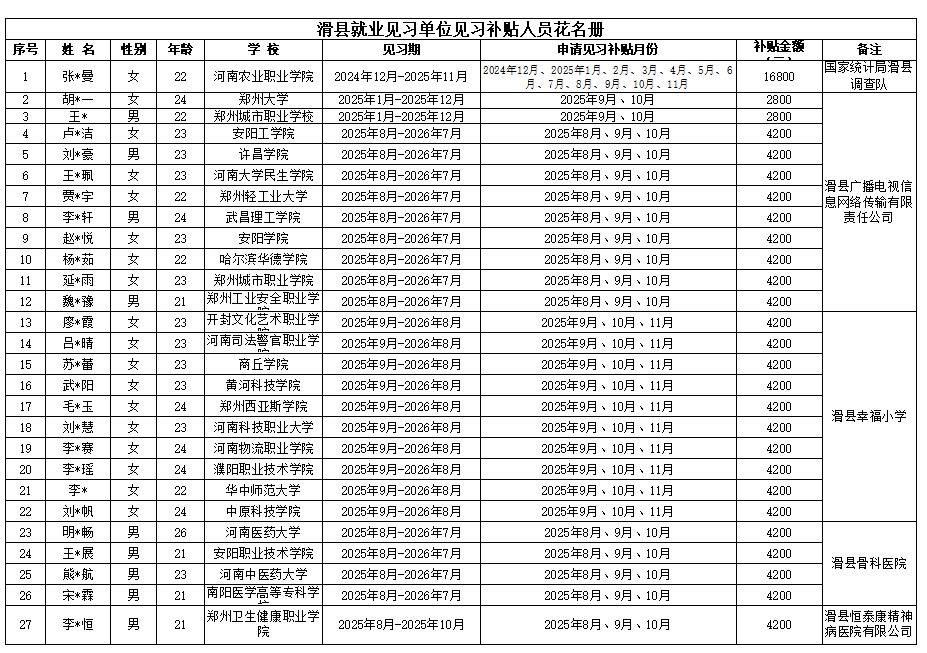 根据河南省财政厅河南省人力资源和社会保障厅关于印发《河南省就业补助资金管理办法》的通知(豫财社〔2024〕194号)文件、河南省人力资源和社会保障厅关于印发《河南省就业见习管理暂行办法》的通知(豫人社规〔2019〕6号)和安阳市人力资源和社会保障局关于印发《安阳市就业见习管理实施细则(暂行)》的通知(安人社就业〔2022〕18号)文件精神,国家统计局滑县调查队、滑县广播电视信息网络传输有限责任公司、滑县幸福小学、滑县骨科医院、滑县恒泰康精神病医院有限公司5家见习单位申报就业见习补贴,共计补贴123200元,现将审核结果予以公示,接受社会监督。公示时间五个工作日(时间从2025年12月4日至2025年12月10日)。在公示期内若对申请人员和审核情况的真实性有异议的可举报。