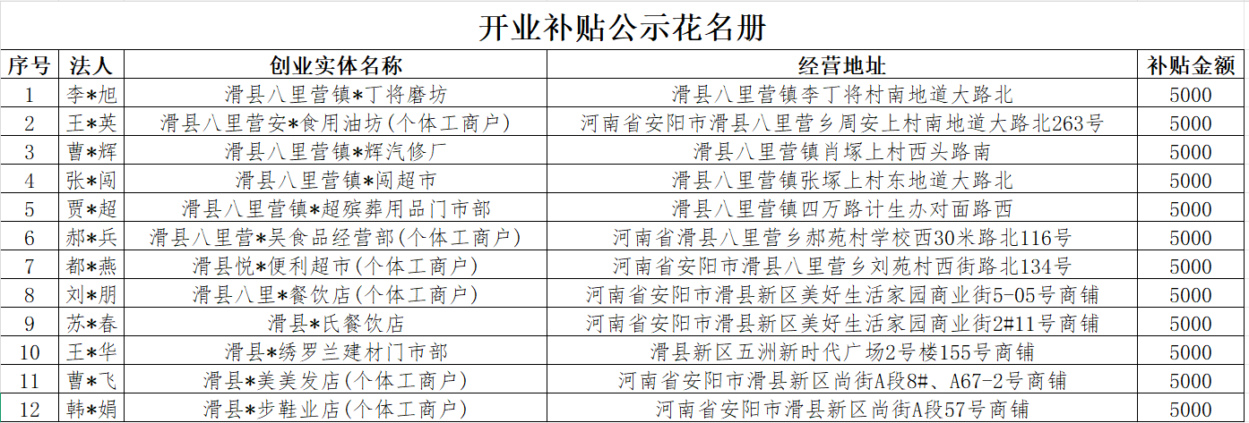 根据《河南省就业补助资金管理办法》(豫财社【2024】194号)第二章第十条文件规定,符合条件的2年内高校毕业生、返乡入乡农民工、退役军人,首次创办小微企业或从事个体经营,且所创办企业或个体工商户自工商登记注册之日起正常运营1年以上的,给予一次性开业补贴,补贴标准为5000元。经审核手续和现场勘查,滑县八里营镇大丁将磨坊等12家符合补贴条件,现将审核结果予以公示,接受社会监督,公示时间为五个工作日(2025年12月11日至12月17日)。