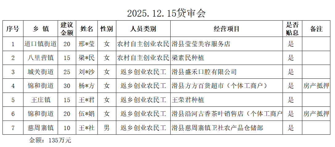 以上7人申请创业担保贷款2025年12月15日经贷审会审核通过,审核程序透明、结果公示,请广大群众予以监督。