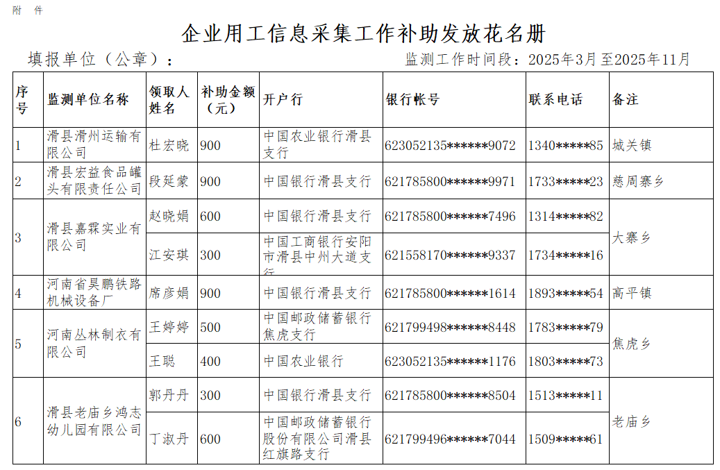 根据《河南省就业补助资金管理办法》《安阳市企业用工监测信息采集补助管理暂行办法》(安人社就业{2023}16号)等文件精神,现将拟发放的2025年3月至12月企业用工采集工作补助发放花名册等情况进行公示。如对公示有问题反映,请于公示期内以书面形式进行反馈。