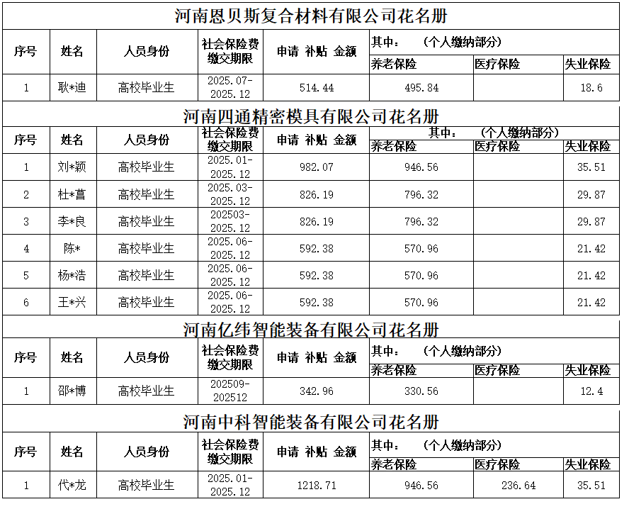 企业吸纳高校毕业生个人社会保险补贴公示