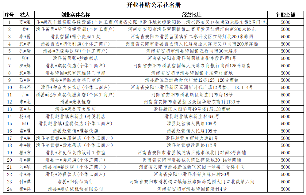 根据《河南省就业补助资金管理办法》(豫财社【2024】194号)第二章第十条文件规定,符合条件的2年内高校毕业生、返乡入乡农民工、退役军人,首次创办小微企业或从事个体经营,且所创办企业或个体工商户自工商登记注册之日起正常运营1年以上的,给予一次性开业补贴,补贴标准为5000元。经审核手续和现场勘查,滑县睿泽防水材料门市部等24家符合补贴条件,现将审核结果予以公示,接受社会监督,公示时间为五个工作日(2025年12月23日至12月29日)。在公示期内若对申请开业补贴的真实性有异议的可举报。