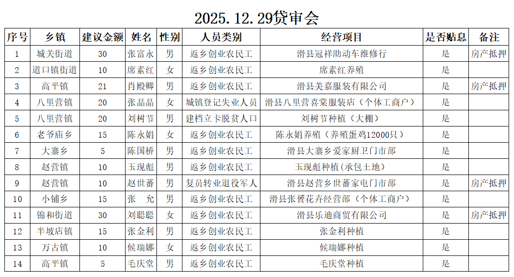 以上14人申请创业担保贷款2025年12月29日经贷审会审核通过,审核程序透明、结果公示,请广大群众予以监督。