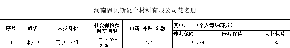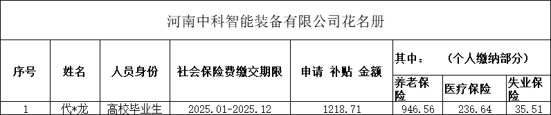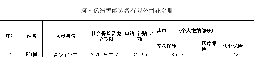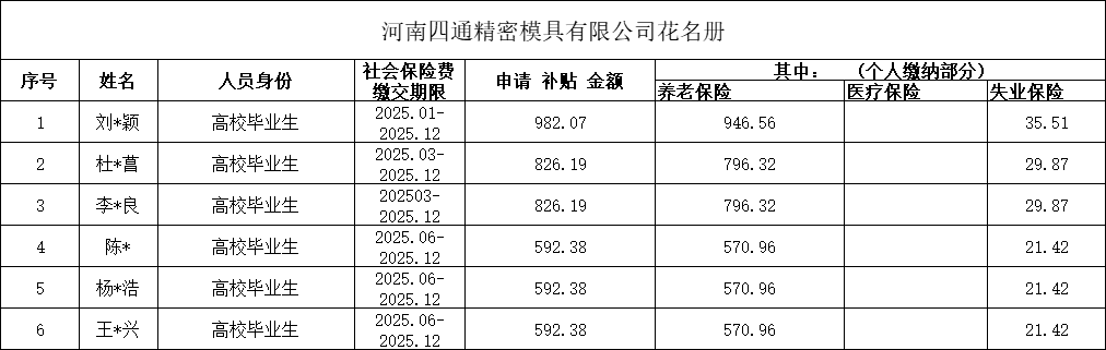 根据《河南省人力资源和社会保障厅 河南省财政厅关于加快落实扩大社会保险补贴范围政策有关工作的通知》(豫人社办函〔2025〕105号)》和《河南省人民政府办公厅关于进一步加大稳就业政策支持力度的通知 》(豫政办明电【2025】29号)文件,现对河南四通精密模具有限公司、河南恩贝斯复合材料有限公司、河南中科智能装备有限公司、河南亿纬智能装备有限公司几家有限公司吸纳的高校毕业生个人社会保险补贴进行公示,补贴金额6487.7元。