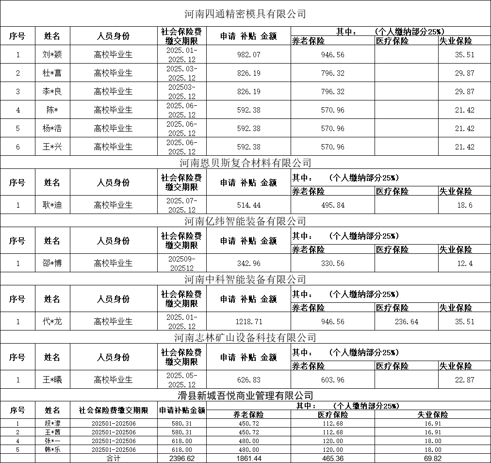 根据豫人社办函〔2025〕105号)第一条“重点行业领域的中小微企业与重点群体签订1年以上劳动合同,按照个人缴费额的25%给予社会保险补贴”;豫政办明电〔2025〕29号)第二款第(四)条“扩大社会保险补贴范围”;《河南省人力资源和社会保障厅关于落实扩大社会保险补贴范围政策有关工作的通知》“第一条合理确定行业范围,将制造业和生活服务业整体纳入支持范围”,现对河南四通精密模具有限公司、河南恩贝斯复合材料有限公司等几家有限公司吸纳的高校毕业生个人社会保险补贴进行公示,补贴金额9511.15元。