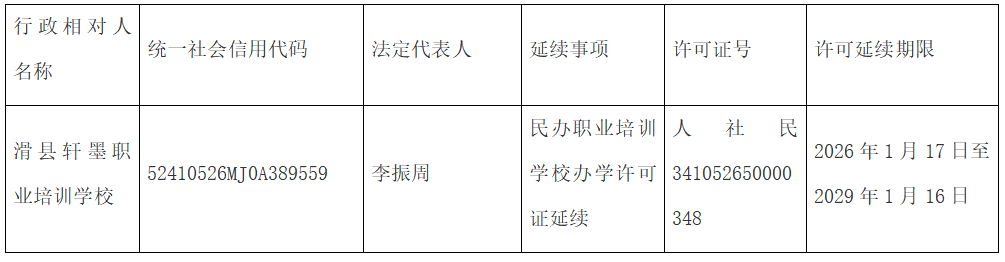 根据《中华人民共和国民办教育促进法》《中华人民共和国民办教育促进法实施条例》《中华人民共和国行政许可法》规定,经材料审核、实地考察等程序,滑县轩墨职业培训学校提交的民办职业培训学校办学许可延续申请符合审批条件,准予其办学许可证延续,现将延续情况予以公示。