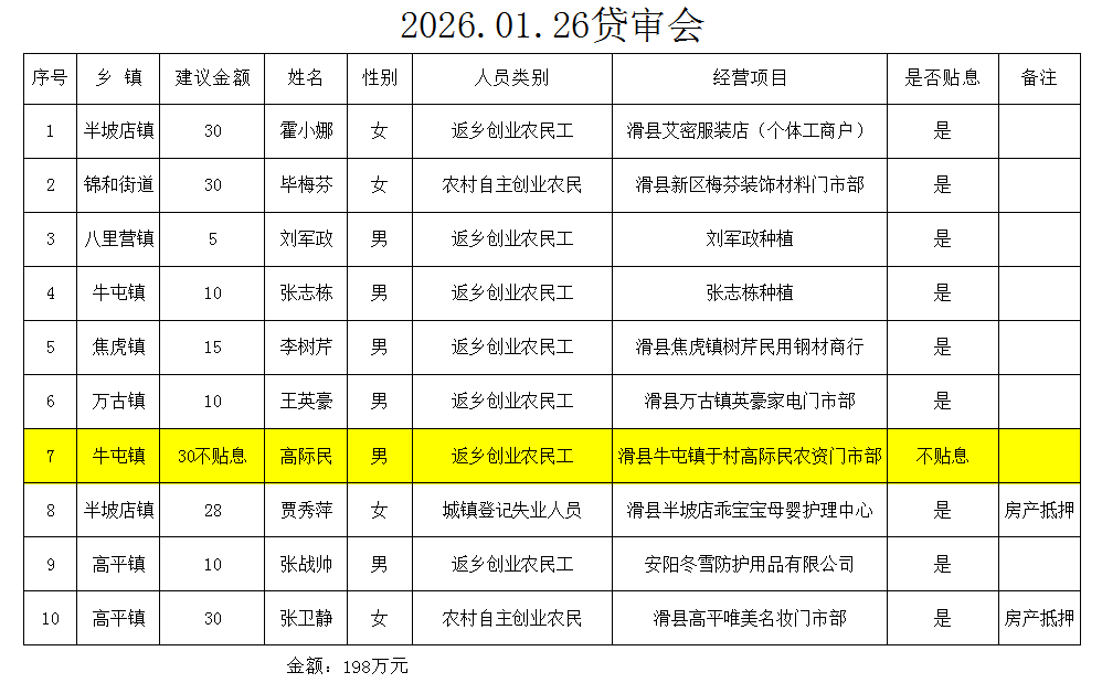 以上10人申请创业担保贷款2026年01月26日经贷审会审核通过,审核程序透明、结果公示,请广大群众予以监督。监督电话:0372-8169591