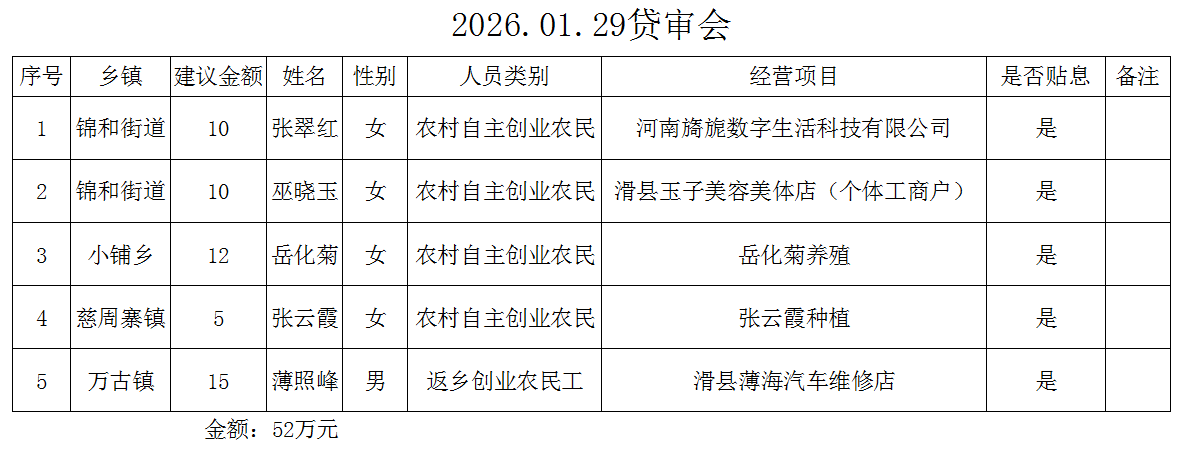 以上5人申请创业担保贷款2026年01月29日经贷审会审核通过,审核程序透明、结果公示,请广大群众予以监督。监督电话:0372-8169591