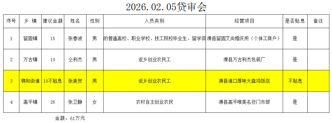 以上4人申请创业担保贷款2026年02月05日经贷审会审核通过,审核程序透明、结果公示,请广大群众予以监督。监督电话:0372-8169591