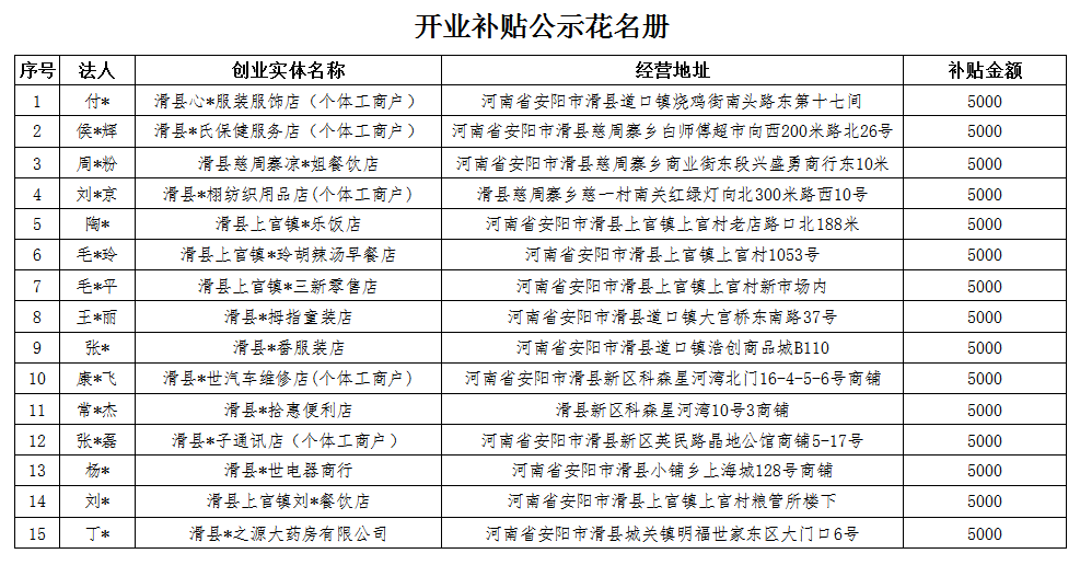 根据《河南省就业补助资金管理办法》(豫财社〔2024〕194号)第二章第十条文件规定,符合条件的2年内高校毕业生、返乡入乡农民工、退役军人,首次创办小微企业或从事个体经营,且所创办企业或个体工商户自工商登记注册之日起正常运营1年以上5年以内的,给予一次性开业补贴,补贴标准为5000元。经审核手续和现场勘查,滑县心仪服装服饰店(个体工商户)等15家符合补贴条件,现将审核结果予以公示,并接受社会监督,公示时间为五个工作日(2026年2月5日至2月11日)。在公示期内若对申请开业补贴的真实性有异议的可举报。