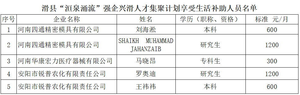 根据中共滑县委办公室、县政府办公室《关于实施“洹泉涌流”强企兴滑人才集聚计划的实施意见》(滑办文〔2020〕2号)及相关细则规定,经审核,拟对下列5人发放生活补助,现予以公示。