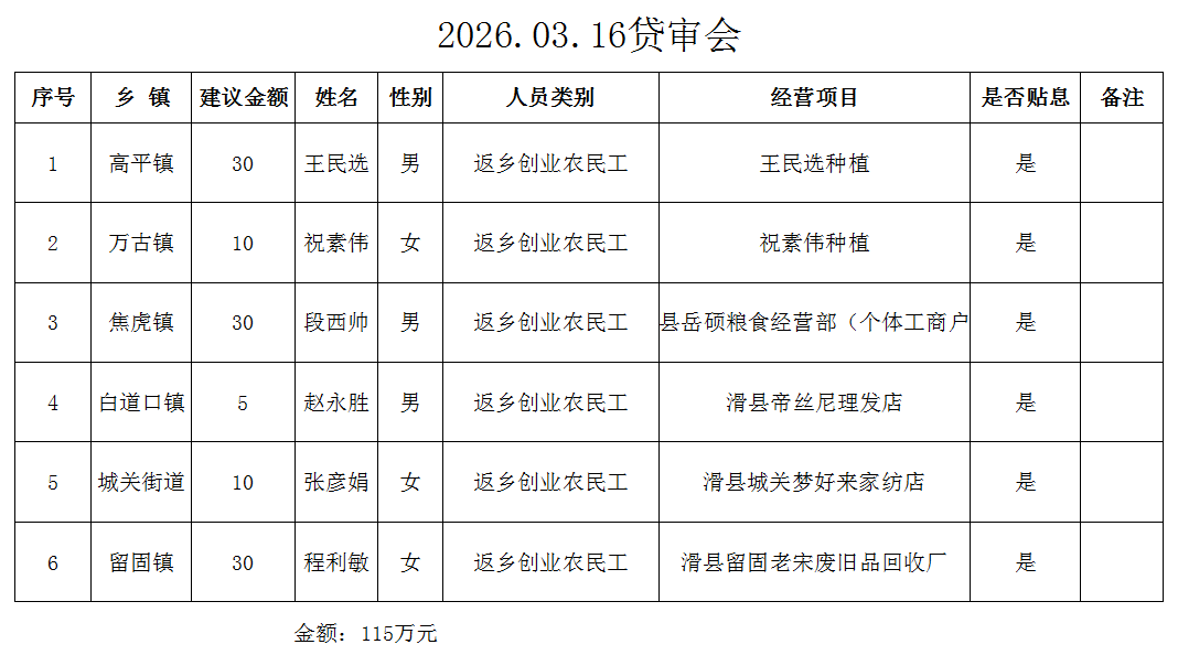 以上6人申请创业担保贷款2026年03月16日经贷审会审核通过,审核程序透明、结果公示,请广大群众予以监督。监督电话:0372-8169591