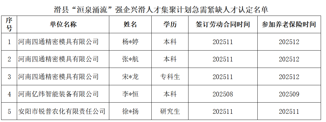 据中共滑县委办公室、县政府办公室《关于实施“洹泉涌流”强企兴滑人才集聚计划的实施意见》(滑办文〔2020〕2号)及人才认定相关细则规定,经单位初审,县人社部门审核,拟认定下列5人为急需紧缺人才,现予以公示。公示时间:2026年3月16日——2026年3月20日,如有异议,可在公示期内向滑县人力资源和社会保障局反映,电话和信函应告知真实姓名,对线索不清的匿名电话和匿名信件,公示期间不予受理。