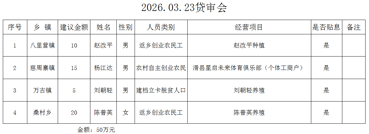 以上4人申请创业担保贷款2026年03月23日经贷审会审核通过,审核程序透明、结果公示,请广大群众予以监督。监督电话:0372-8169591