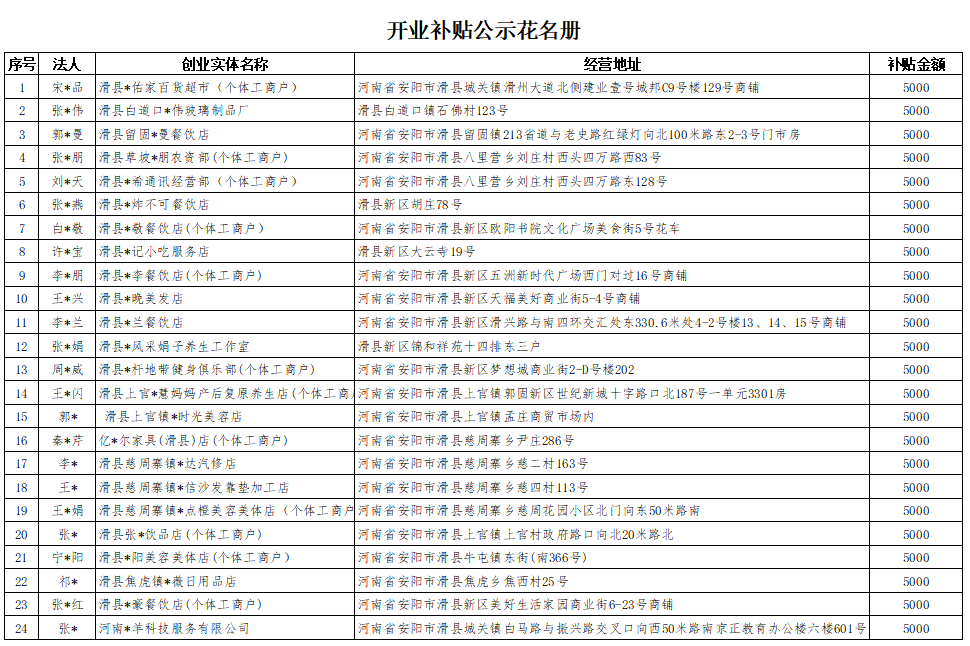 根据《河南省就业补助资金管理办法》(豫财社〔2024〕194号)第二章第十条文件规定,符合条件的2年内高校毕业生、返乡入乡农民工、退役军人,首次创办小微企业或从事个体经营,且所创办企业或个体工商户自工商登记注册之日起正常运营1年以上5年以内的,给予一次性开业补贴,补贴标准为5000元。经审核手续和现场勘查,滑县福佑家百货超市(个体工商户)等24家符合补贴条件,现将审核结果予以公示,并接受社会监督,公示时间为五个工作日(2026年4月3日至4月10日)。在公示期内若对申请开业补贴的真实性有异议的可举报。