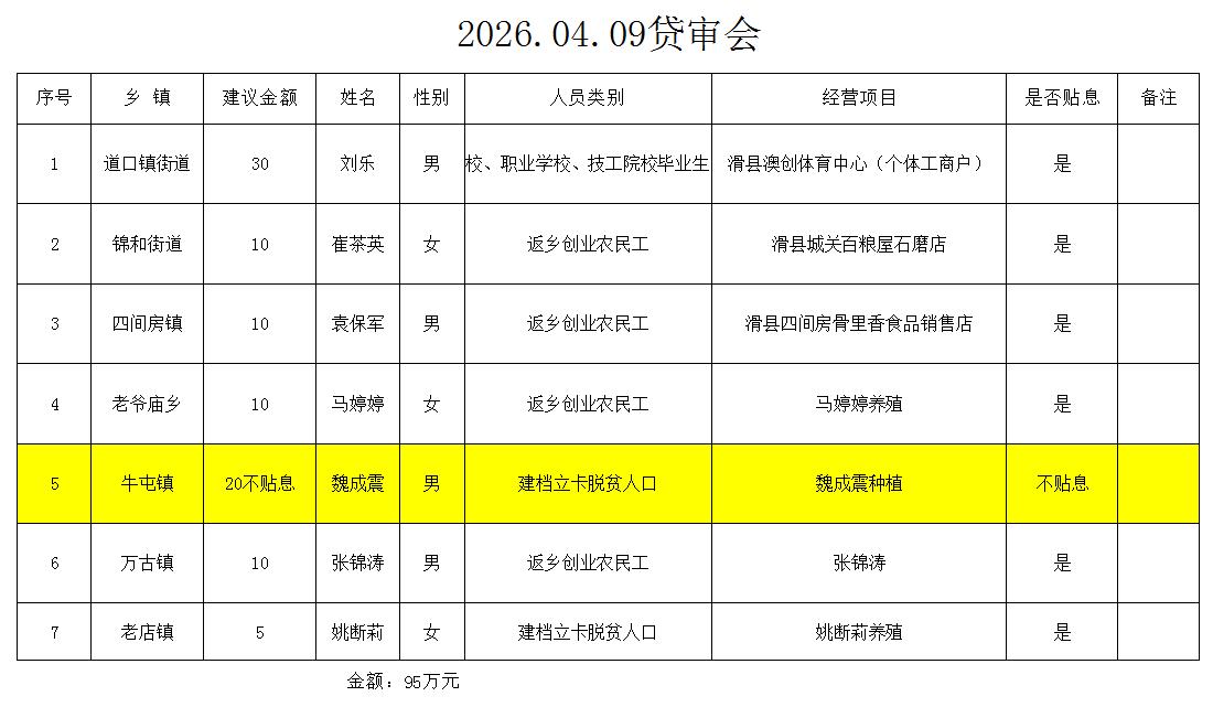 以上7人申请创业担保贷款2026年04月09日经贷审会审核通过,审核程序透明、结果公示,请广大群众予以监督。监督电话:0372-8169591