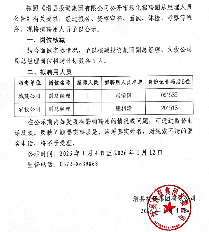 滑县投资集团有限公司公开市场化招聘副总经理拟聘用人员公示