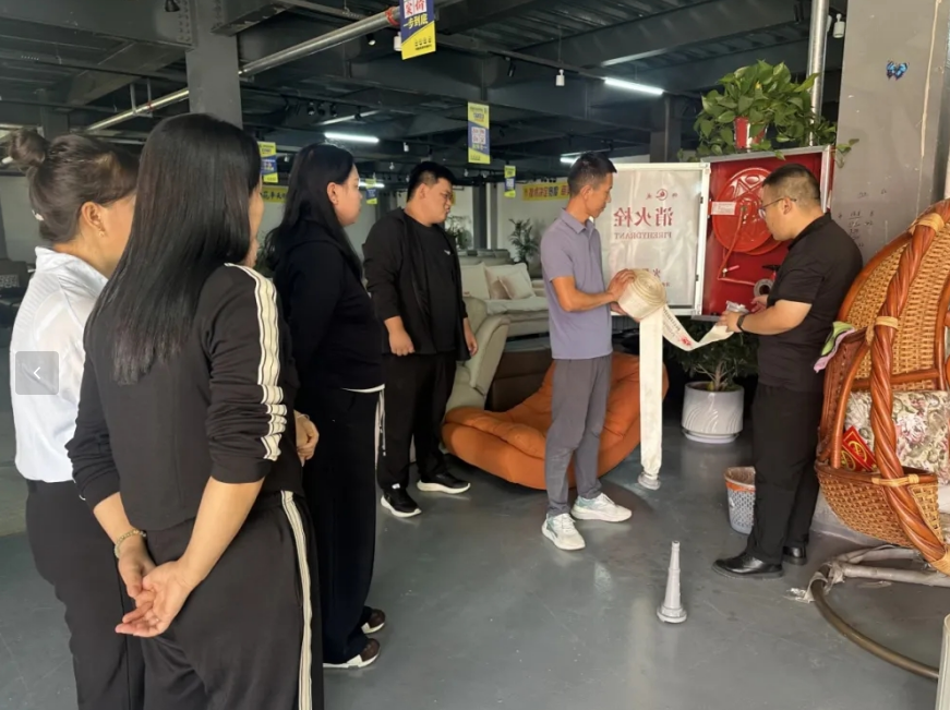 演练前,镇应急办工作人员结合家具企业木料、海绵等易燃物料集中的特点,开展了消防安全知识培训。通过实物演示与现场讲解,详细介绍了消防栓的正确连接步骤,以及灭火器“提、拔、握、压”四字使用口诀,系统讲解了初期火灾扑救技巧、应急逃生路线选择方法和浓烟环境下的自我防护要点。在随后的实操环节中,企业员工依次进行灭火器实操训练,亲手扑灭明火,工作人员全程指导并纠正操作动作,确保每位员工都能熟练掌握核心消防技能。