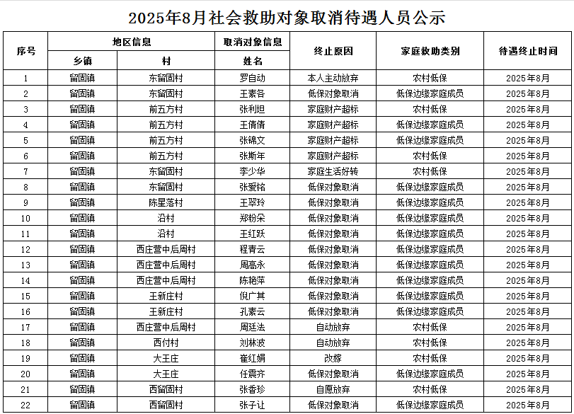 留固镇2025年8月社会救助对象取消待遇人员公示